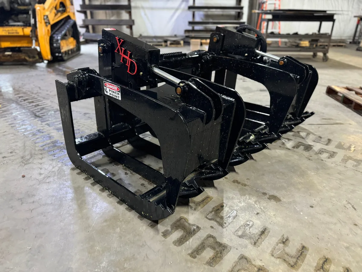 1/2" high strength steel, 9" tine spacing, 46.5" opening, replaceable pins. Hoses routed internally for protections. This is the most durable grapple on the market. Reinforced quick attach plate. Very beefed up for durability.