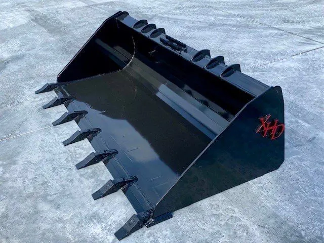 XHD 73" Heavy Duty Skid Steer bucket by XHD. Brand new and built for rigorous use, our buckets offer top-tier performance for all your heavy-duty construction needs. for starters, the inside of the bucket is 1 single curved piece, not 3 pieces of metal welded together like most buckets. Perfect for professionals seeking strength and longevity in their attachments. Built tough with 4 x 1/2 thick wear strips for added strength, reinforced quick attach plate, Geith style teeth.
